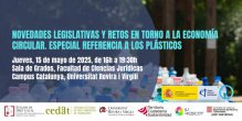 El proper 15 de maig es celebrarà a la Sala de Graus de la Facultat de Ciències Jurídiques de la Universitat Rovira i Virgili, el seminari: "Novedades legislativas y retos en torno a la economía circular. Especial referencia a los plásticos". Dins el projecte Canvi climàtic i residus plàstics: desafiaments jurídics de l'economia circular com a paradigma per a la tutela de la salut i la justícia planetàries (JUSTCIRCULAR)