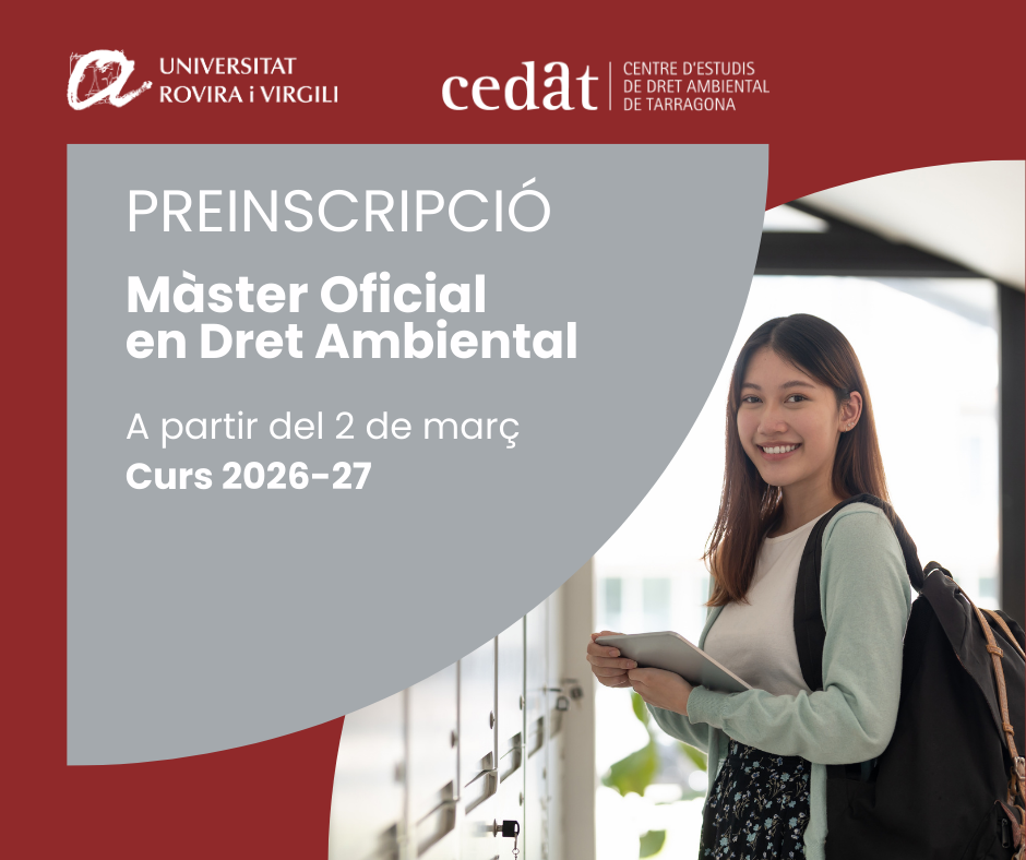 El proper 2 de març de 2026 s'iniciarà el període de preinscripció del Màster Oficial en Dret Ambiental per al curs acadèmic 2026-27.