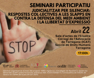 El seminari participatiu “Judicialitzar per silenciar: respostes col·lectives a les SLAPP en contra la defensa del medi ambient i la llibertat d'expressió” té lloc aquest 22 d'abril a l'Il·lustre Col·legi de l'Advocacia de Tarragona.