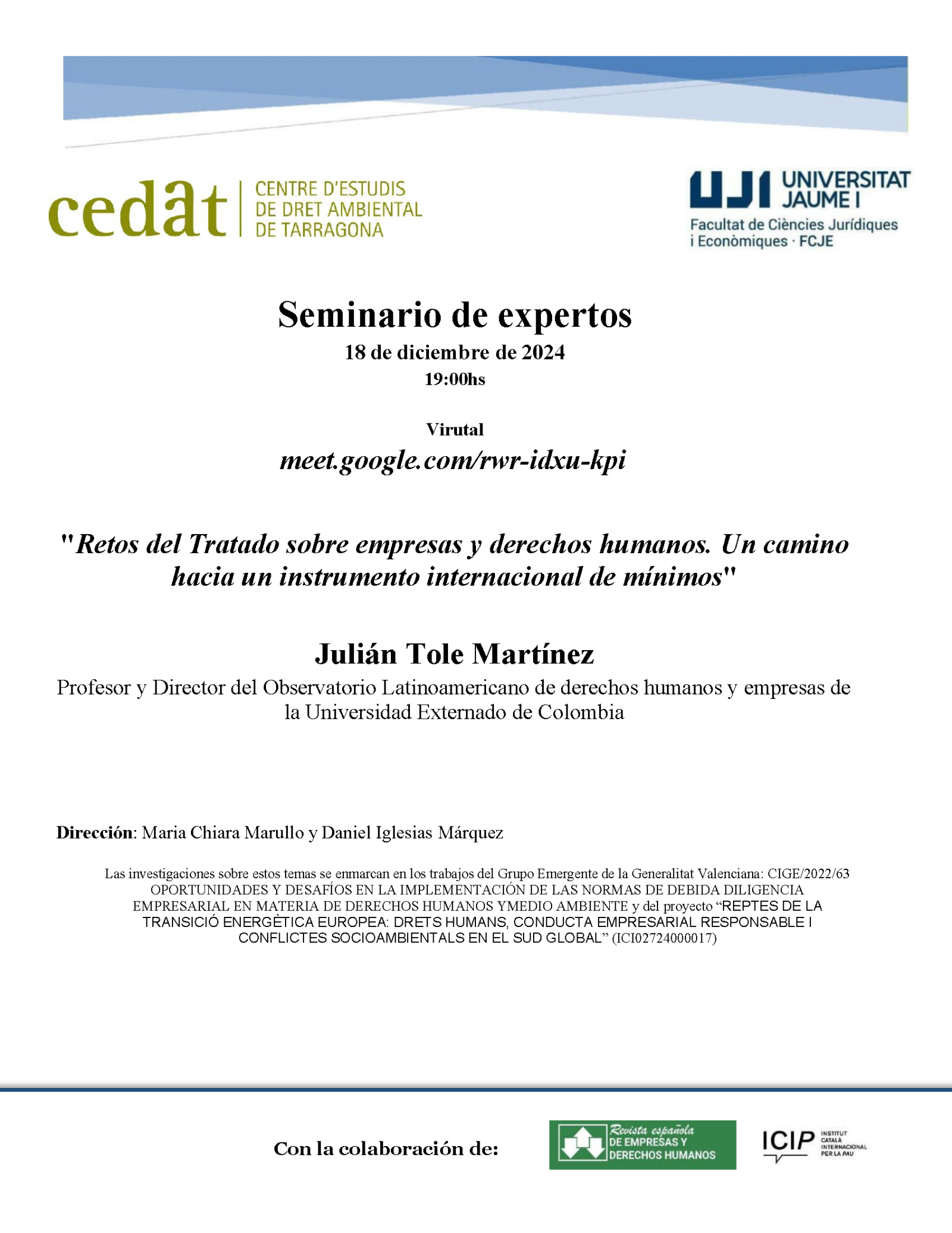 El proper 18 de desembre, a les 19:00 h, es celebrarà un seminari en línia amb Julián Tole Martínez, professor de la Universitat Externado de Colòmbia, que parlarà sobre els "Reptes del Tractat sobre empreses i drets humans. Un camí cap a un instrument internacional de mínims".