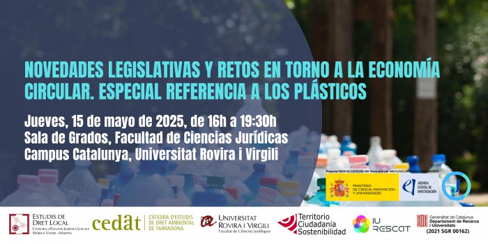 El proper 15 de maig es celebrarà a la Sala de Graus de la Facultat de Ciències Jurídiques de la Universitat Rovira i Virgili, el seminari: "Novedades legislativas y retos en torno a la economía circular. Especial referencia a los plásticos". Dins el projecte Canvi climàtic i residus plàstics: desafiaments jurídics de l'economia circular com a paradigma per a la tutela de la salut i la justícia planetàries (JUSTCIRCULAR)