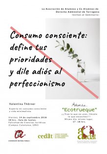 La Asociación de Alumnos y Ex Alumnos de Derecho Ambiental de Tarragona (AAEDAT) tiene el agrado de invitarles al seminario "Consumo consciente: define tus prioridades y dile adiós al perfeccionismo" que tendrá lugar el día viernes 14 de septiembre del presente año a las 18:00 hrs. en la Sala de Juntas de la Facultad de Ciencias Jurídicas del Campus Catalunya de la URV. El seminario estará a cargo de la experta en consumo consciente y vida minimalista Valentina Thörner.