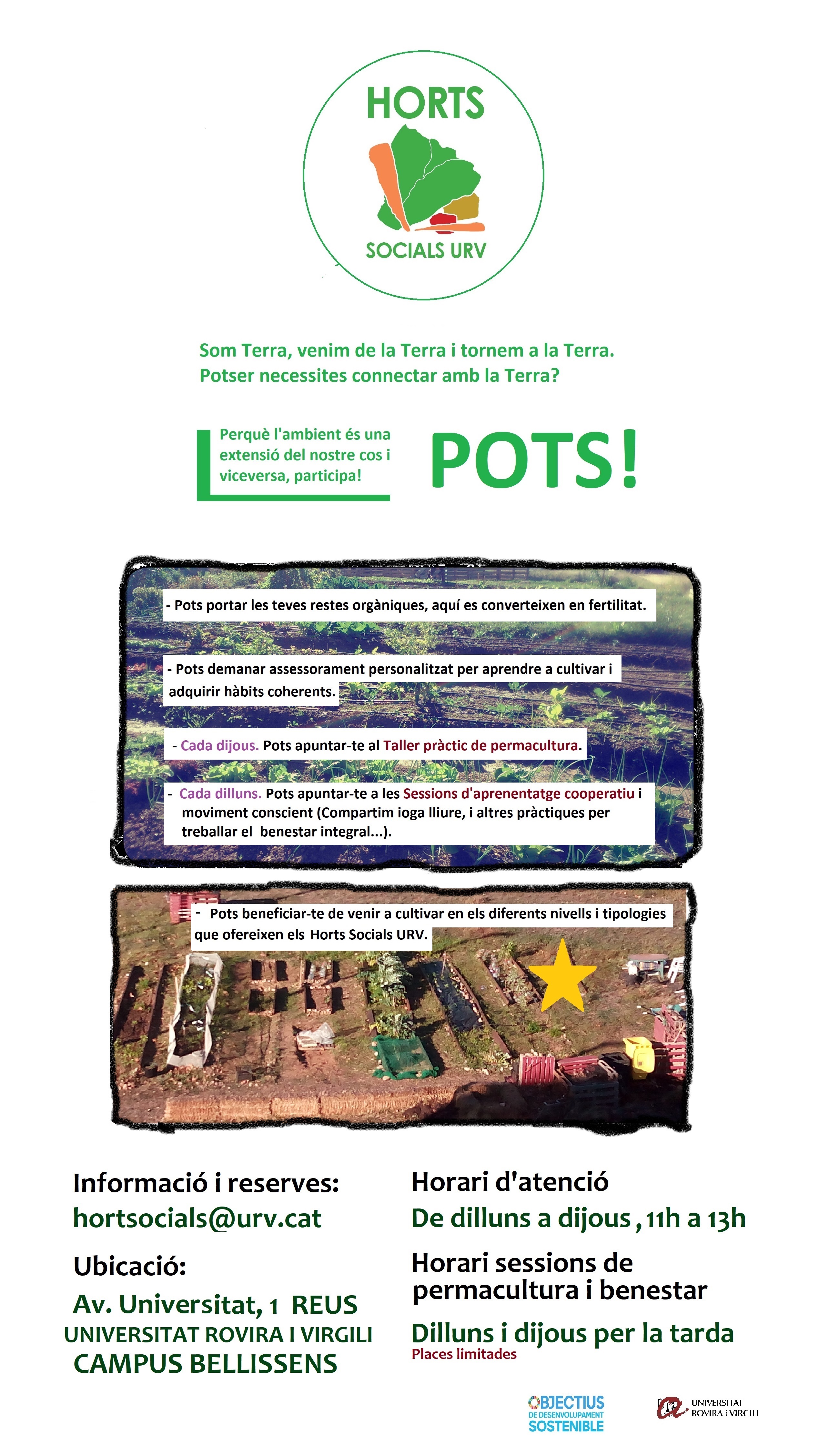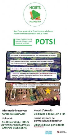 En favor i millora de la situació socioambiental actual i apuntant a un camí cap al benestar personal us informem de l'existència, les possibilitats i l'activitat dels Horts Socials URV (Sempre en funció de la situació sanitària i les restriccions).
