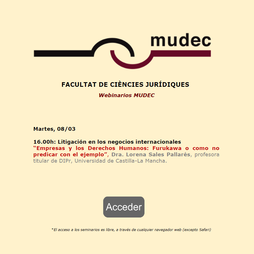 "Empresas y los Derechos Humanos: Furukawa o como no predicar con el ejemplo", Dra. Lorena Sales Pallarés, profesora titular de DIPr, Universidad de Castilla-La Mancha.