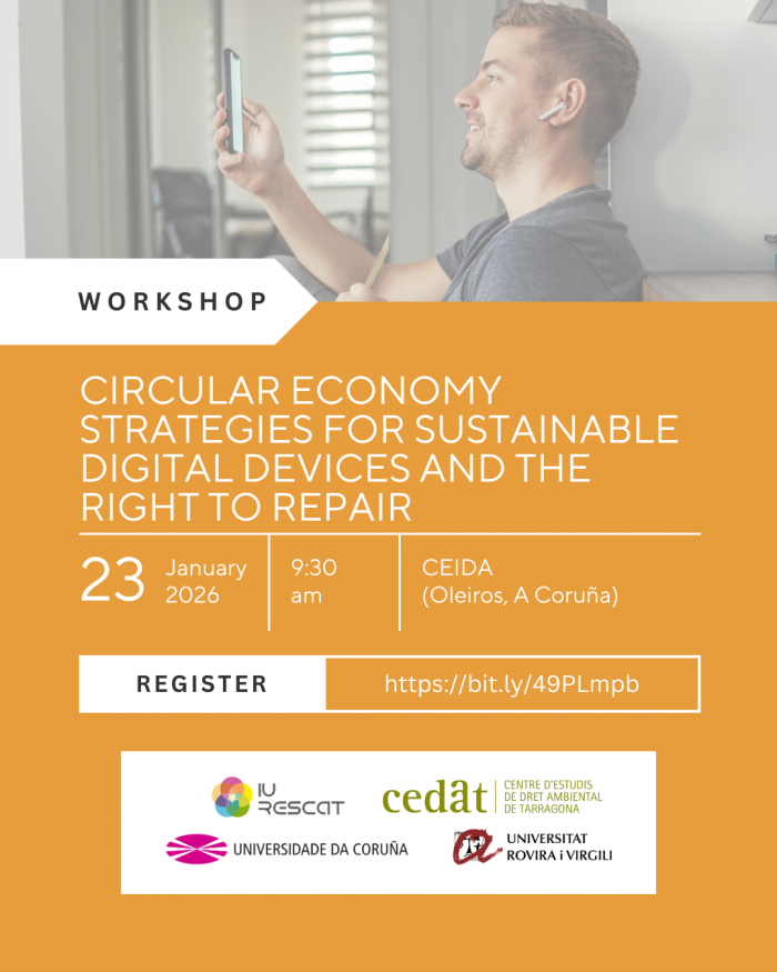 El proper 23 de gener de 2026 tindrà lloc a A Coruña el workshop internacional Circular Economy Strategies for Sustainable Digital Devices and the Right to Repair, una jornada acadèmica dedicada a analitzar els reptes econòmics, jurídics i socials del dret a reparar els dispositius digitals en el marc de l'economia circular.