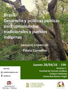 L' Associación d'Alumnes i Ex-alumnes de Dret Ambiental de Tarragona (AAEDAT) organitzen un col·loqui sobre medi ambient titulat "Brasil: Desarrollo y políticas públicas para comunidades tradicionales y pueblos indígenas", a càrrec del sociòleg i antropòleg Flávio Carvalho.