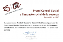 El Grup de recerca de la URV Territori, Ciutadania i Sostenibilitat (2014- SGR 294) ha estat el guanyador del Premi Consell Social URV a l'Impacte Social de la Recerca.