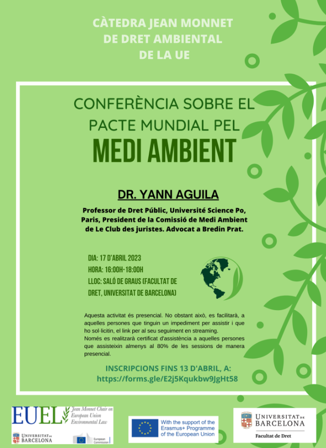 El lunes 17 de abril 2023, tendrá lugar la Conferencia sobre el Pacto Mundial por el Medio Ambiente. Se realizará en el Salo de Graus (Facultad de Derecho UB) de 16:00h a 18:00h.