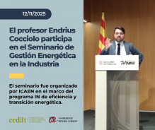 El pasado 12 de noviembre, Endrius Cocciolo, profesor de Derecho Administrativo de la Universitat Rovira i Virgili e investigador del CEDAT, participó como ponente en el Seminario de Gestión Energética en la Industria organizado por el ICAEN, en el marco del programa de formación IN sobre eficiencia y transición energética en el ámbito industrial. La sesión, dedicada a la flexibilidad de la demanda y las comunidades energéticas industriales, permitió analizar en profundidad el potencial transformador de estas figuras dentro del nuevo modelo energético. Durante su intervención, Endrius Cocciolo abordó: